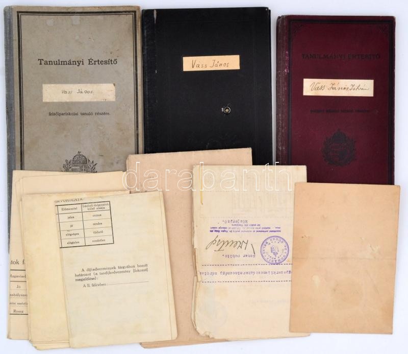 Beschreibung: cca 1930-1940 Felső iskolai faipari tanuló, gépészmérnök hallgató igazolványai, bizonyítványai, összesen 10 db