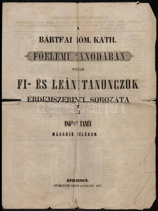 1867 Bártfai Róm. Kath. Főelemi Tanodában tanuló fi- és leánytanonczok... https://www.darabanth.com/de/359-Fernauktion/359.0/Kunst-Dokumente-andere-Sammelgebiete/Drucksachen~500030/1867-Bartfai-Rom-Kath-Foelemi-Tanodaban-tanulo-fi-es-leanytanonczok-erdemszerinti-sorozat~II2006038