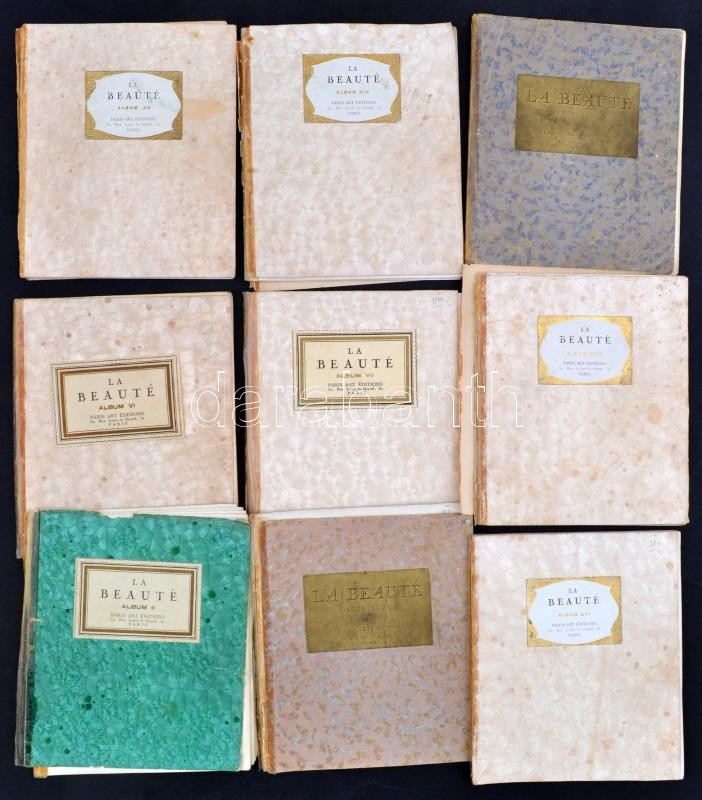 cca 1920-26 La Beauté Albumok 9 db, egyenként kb 30 oldalas erotikus fotókat tartalmazó album kísérőszöveggel. Márványozott papírborítóval, könyvtestek nagyrészt elváltak. / Collection of 9 erotic albums, with many hundred erotic photos in different condition