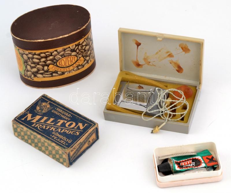 Kis retro, bolha tétel: 1959-es kávésdoboz, Milton iratkapocs, Medicor... https://www.darabanth.com/de/359-Fernauktion/359.0/Kunst-Dokumente-andere-Sammelgebiete/Flohmarkt~500012/Kis-retro-bolha-tetel-1959-es-kavesdoboz-Milton-iratkapocs-Medicor-fulhallgato-gumibelso-~II2065681