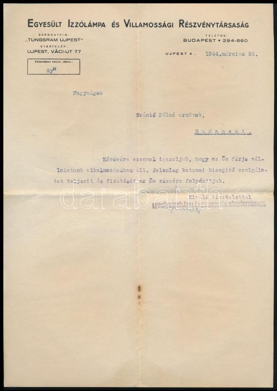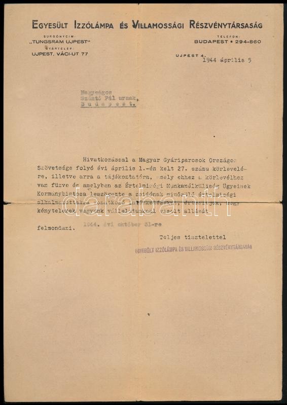 1944 Az Egyesült Izzó (mely próbálta védeni zsidó alkalmazottait) két levele, amely mutatja hogy az 1944. április 1-jén kiadott zsidó értelmiségi alkalmazottakra vonatkozó szigorítás elől nem lehetett kitérni, hozzá tartozik a levélben említett Szántó Pál kisegítő munkásszázadi eltávozási engedélye pecsételve és aláírva