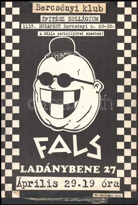 Beschreibung: 1989 Rádi Sándor (?-?): Bercsényi Klub. Fals!, Ladánybene 27., 1989. Április 29., Underground koncertplakát, ragasztásnyomokkal, 41x28 cm.