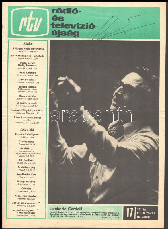 Beschreibung: Kobajasi Kenicsíro (1940-) japán karmester és Lamberto Gardelli (1915-1998) olasz karmester aláírásai újság címlapján