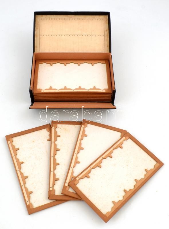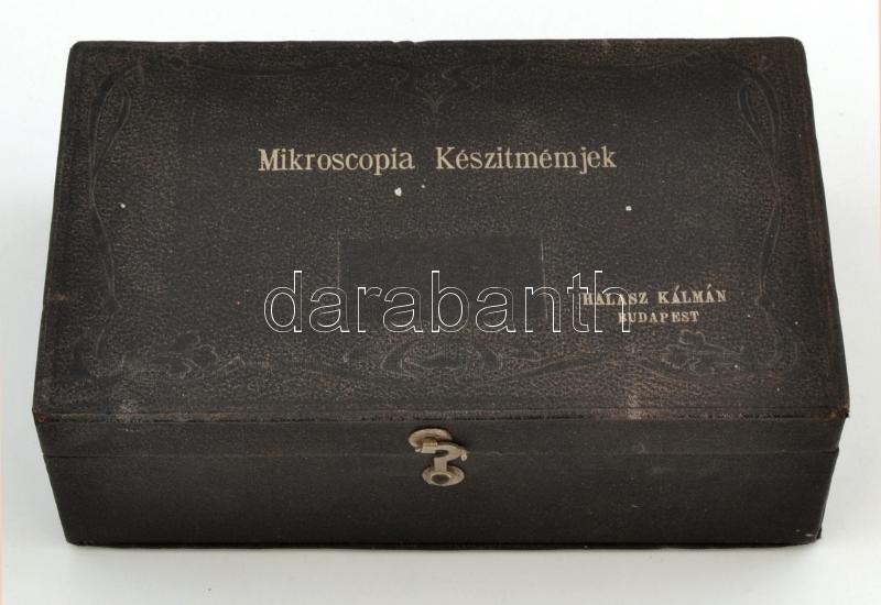 "Mikroscopia Készítmémjek, Halász Kálmán. Budapest", feliratú doboz, benne 10 db mikroszkóp üveglap tároló kartonlappal, kartonlapok: 17x10 cm, doboz: 11x19x6 cm