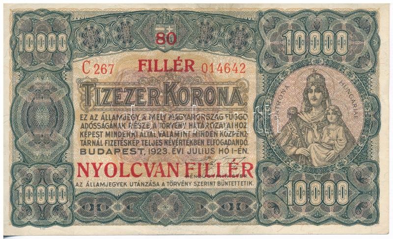 1923. 10.000K "80 Fillér - Nyolcvan fillér" felülnyomással, ... https://www.darabanth.com/de/359-Fernauktion/359.0/Numismatik/Ungarische-Banknoten~2000007/1923-10000K-80-Filler-Nyolcvan-filler-felulnyomassal-nyomdahely-jeloles-nelkul-TII-~II2068574