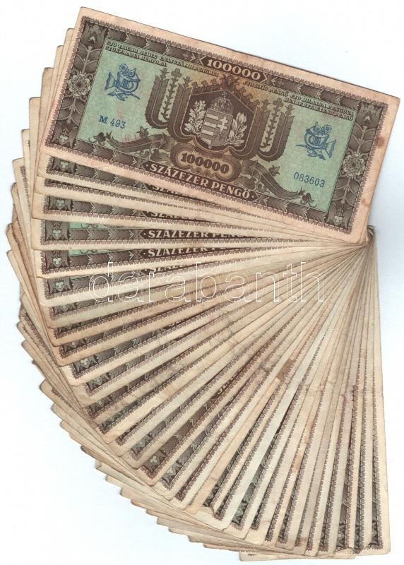 1945. 100.000P (32x) T:III firkálás Adamo P24A https://www.darabanth.com/de/359-Fernauktion/359.0/Numismatik/Ungarische-Banknoten~2000007/1945-100000P-32x-TIII-firkalas-Adamo-P24A~II2066256