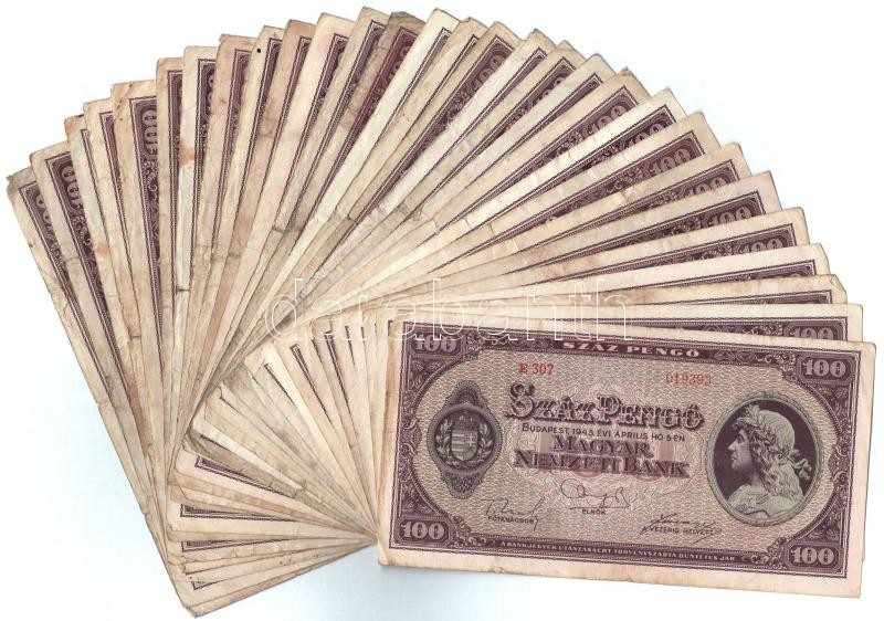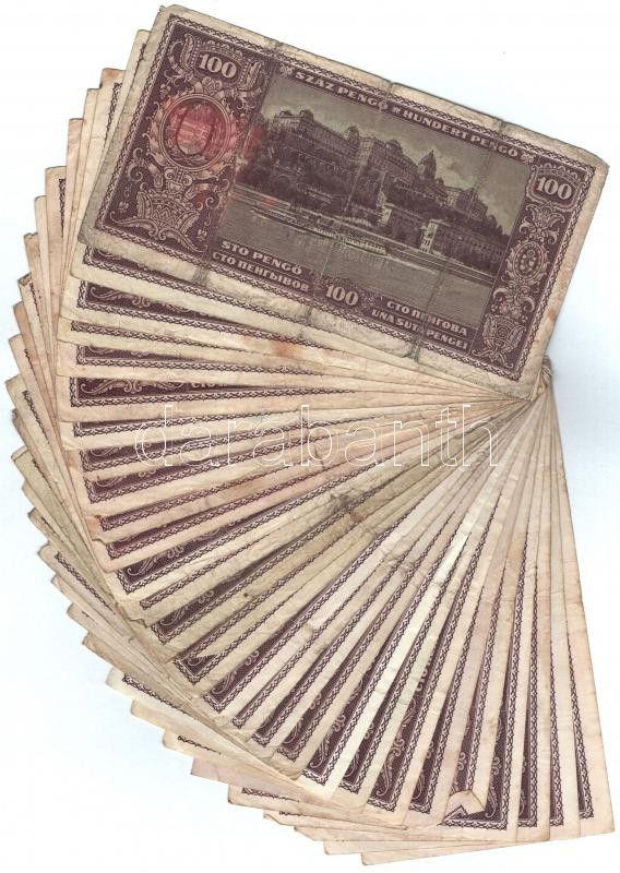 1945. 100P (30x) T:III,III- Adamo P18 https://www.darabanth.com/de/359-Fernauktion/359.0/Numismatik/Ungarische-Banknoten~2000007/1945-100P-30x-TIII-III-Adamo-P18~II2065952