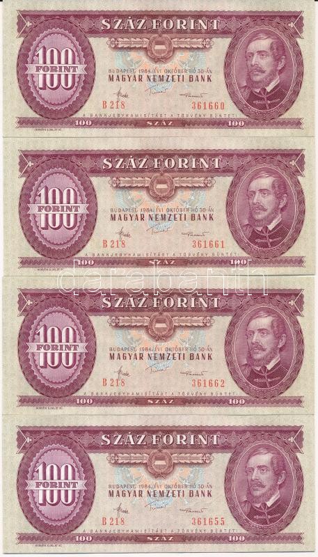 1984. 100Ft (4x) közte 3db sorszámkövető és 1db közeli sorszám, nyomda... https://www.darabanth.com/de/359-Fernauktion/359.0/Numismatik/Ungarische-Banknoten~2000007/1984-100Ft-4x-kozte-3db-sorszamkoveto-es-1db-kozeli-sorszam-nyomdai-papirrancokkal-TI-~II2061401