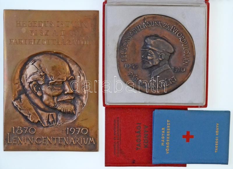 Beschreibung: 1970. "LENIN CENTENÁRIUM 1870-1970" Br plakett, gravírozással + 1970. "FELSZABADULÁSUNK 25. ÉVFORDULÓJÁN 1945-1970 - PÁRTMUNKÁÉRT" Br plakett, eredeti tokban + tagsági igazolvány, bélyegekkel T:vegyes