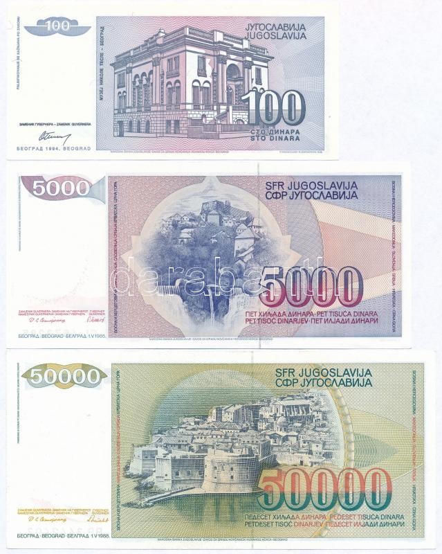 Yugoslavia 1985. 5000 Dinara + 1988. 50.000 Dinara + 1994. 100 Dinara C:UNC,AU