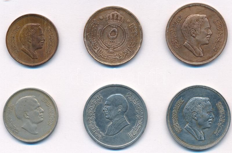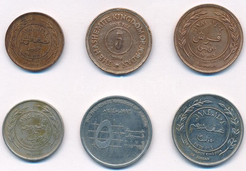 Jordánia 1964-1978. 5f Br (2x) + 1974. 50f Cu-Ni + 1975. 25f Cu-Ni + 1984. 10f Br + 1993. 5P Ni-acél T:2 ph. Jordan 1964-1978. 5 Fils Br (2x) + 1974. 50 Fils Cu-Ni + 1975. 25 Fils Cu-Ni + 1984. 10 Fils Br + 1993. 5 Piastres Ni plated steel C:XF edge error