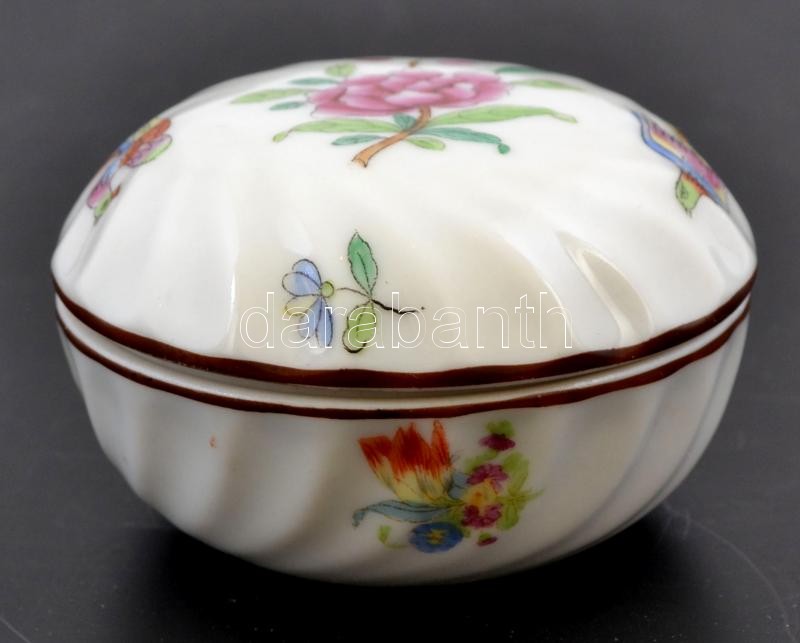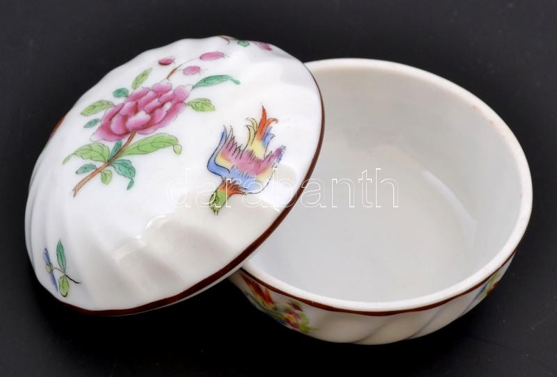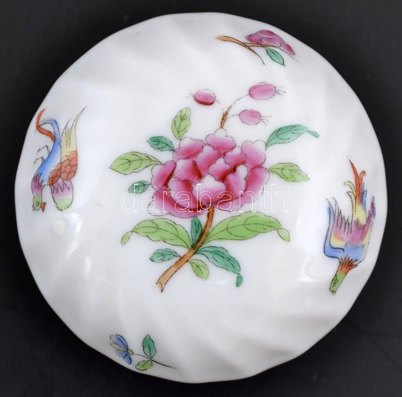 Beschreibung: Herendi madaras virágos ékszertartó dobozka, kézzel festett, jelzett, kopásnyomokkal, d: 6,5 cm