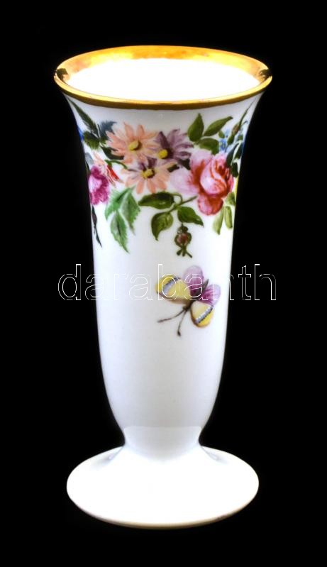 Beschreibung: Pillangós-virágmintás porcelán kis váza, kézzel festett, jelzett, kis kopásnyomokkal, m: 12 cm