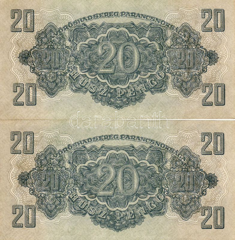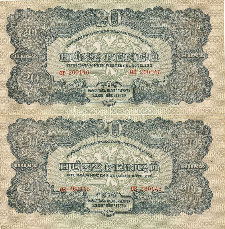 1944. 20P "V.H." 2 db egymásutáni sorszámmal, az egyik példányon extré... https://www.darabanth.com/de/36-Fernauktion/36.0/Numismatik/~73/1944-20P-VH-2-db-egymasutani-sorszammal-az-egyik-peldanyon-extrem-eros-kepeltolodas-~II71739