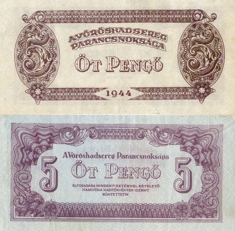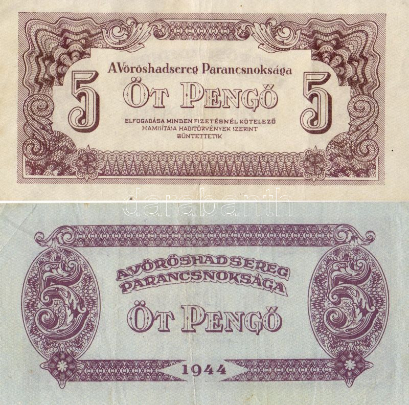 1944. 5P (2x) egyiknél alapszínhiány + ékezethiányok T:II https://www.darabanth.com/de/36-Fernauktion/36.0/Numismatik/~73/1944-5P-2x-egyiknel-alapszinhiany-plus-ekezethianyok-TII~II71721