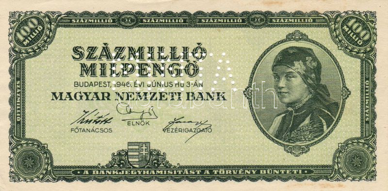 Beschreibung: 1946. 100.000.000Milpengő "Minta" lyukasztással + hátoldalán postabélyeg alkalmi lila egyesületi bélyegzővel T:I-