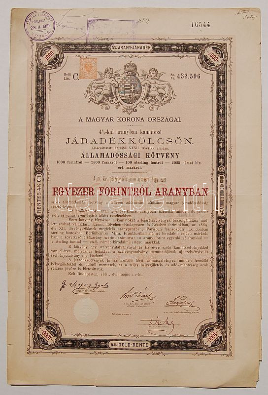 1881. Járadékkölcsön 1000Ft-ról https://www.darabanth.com/de/36-Fernauktion/36.0/Numismatik/~83/1881-Jaradekkolcson-1000Ft-rol~II71757