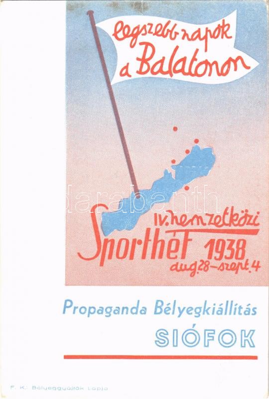 1938 Siófok, IV. Nemzetközi Sporthét, propaganda Bélyegkiállítás. Legs... https://www.darabanth.com/de/36-Gross-Auktion/36.1/Ansichtskarten/Briefmarken~15481/1938-Siofok-IV-Nemzetkozi-Sporthet-propaganda-Belyegkiallitas-Legszebb-napok-a-Balatonon-~II2478529