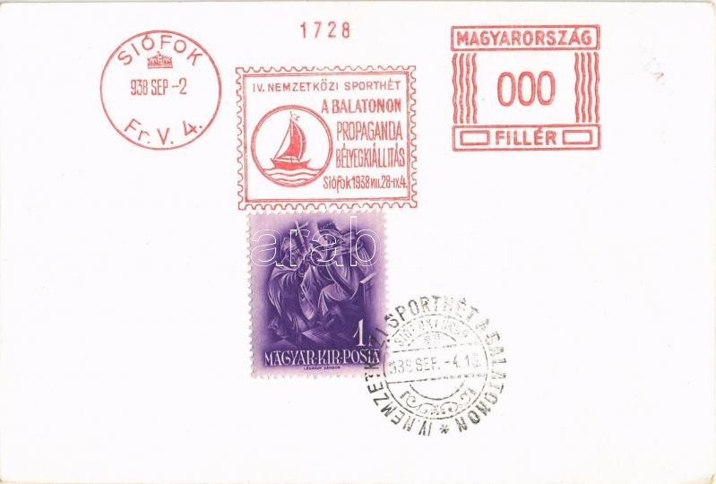 Beschreibung: 1938 Siófok, IV. Nemzetközi Sporthét, propaganda Bélyegkiállítás. Legszebb napok a Balatonon + So. Stpl (non PC)