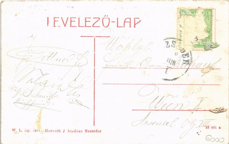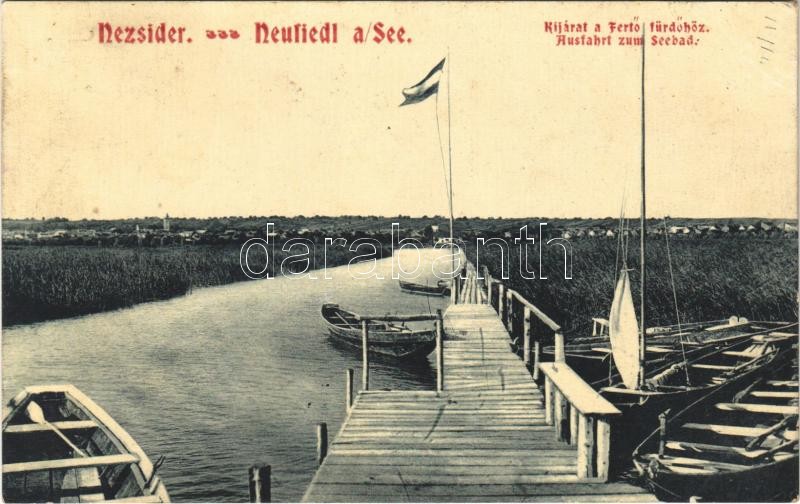 Nezsider, Neusiedl am See; Kijárat a Fertő fürdőhöz a tónál, csónakok. W.L. Bp. 7493. Horváth J. kiadása / Ausfahrt zum Seebad / lake, pier, boats (fl)