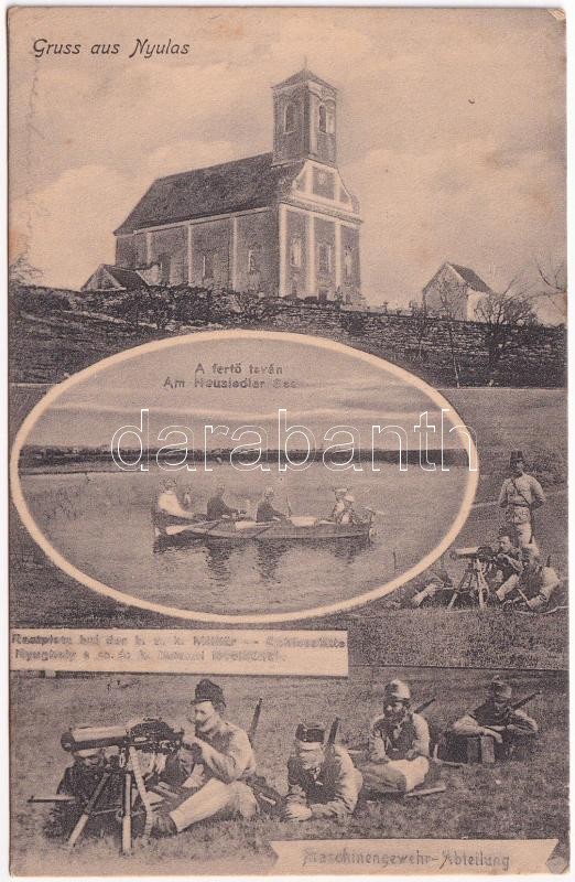 Nyulas, Geoys, Jois; Csonakázás a Fertő taván, templom, nyughely a cs. és kir. katonai lövöldénél / Kirche, Am Neusiedler See, K.u.K. Maschinengewehr Abteilung / church, lake, military shooting practice, soldiers. Art Nouveau (fl)