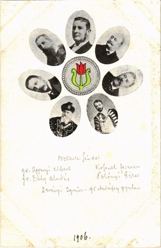 A második Wekerle-kormány tagjai: Wekerle Sándor, Ifj. Andrássy Gyula, Polónyi Géza, Kossuth Ferenc, Apponyi Albert, Josipovich Géza, Zichy Aladár. tulipános, hazafias lap, Örömy Sándor kiadása / Hungarian Goverment of 1906