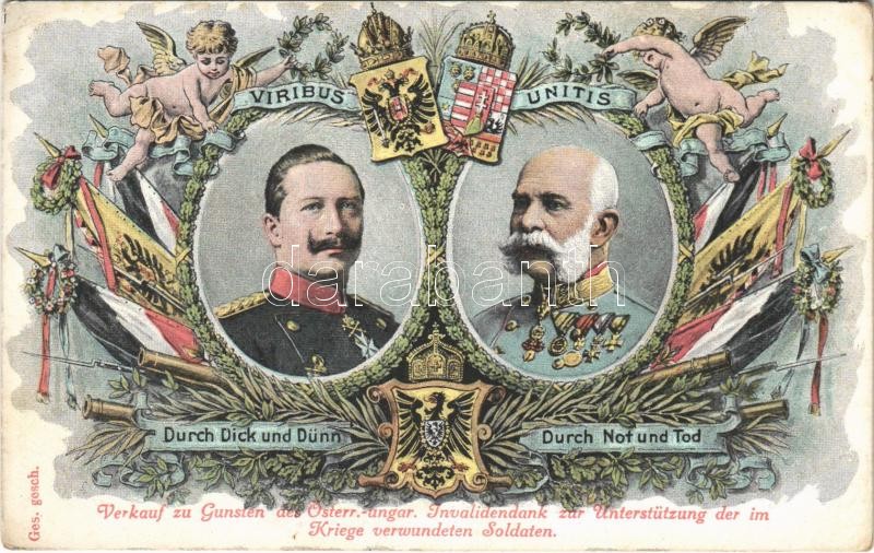 Durch Dick und Dünn durch Not und Tod / II. Vilmos és Ferenc József császár. Szecessziós díszes propganda / Wilhelm II and Franz Josef, Viribus Unitis propaganda, Art Nouveau (EK)