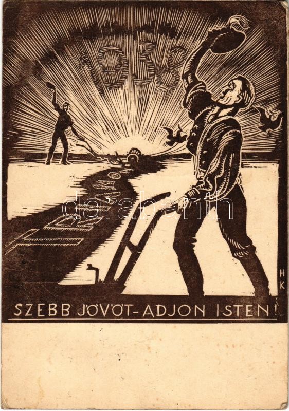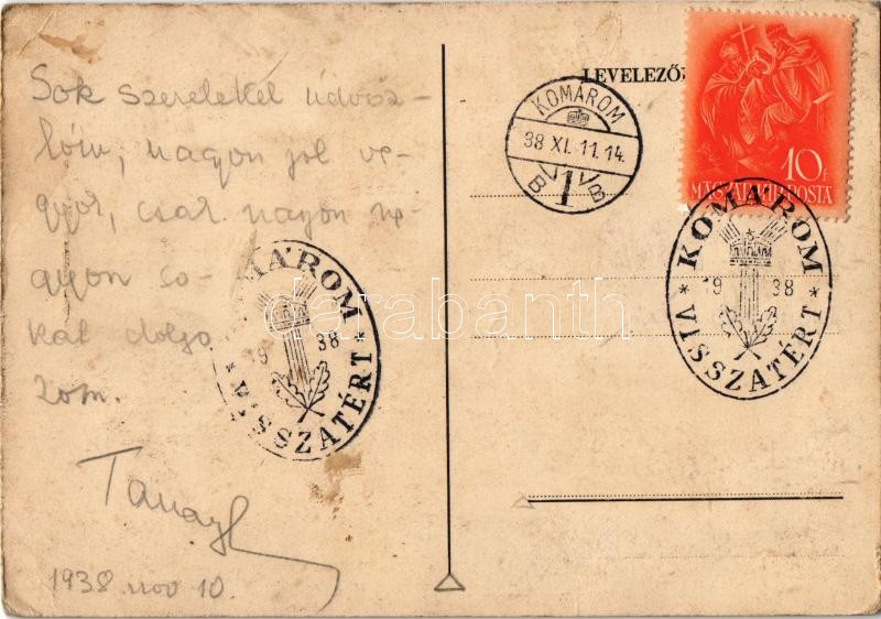 Beschreibung: 1938 Szebb Jövőt adjon Isten! Trianon. Fametszet / Hungarian irredenta woodcut s: H.K. + "1938 Komárom visszatért" So. Stpl (EK)