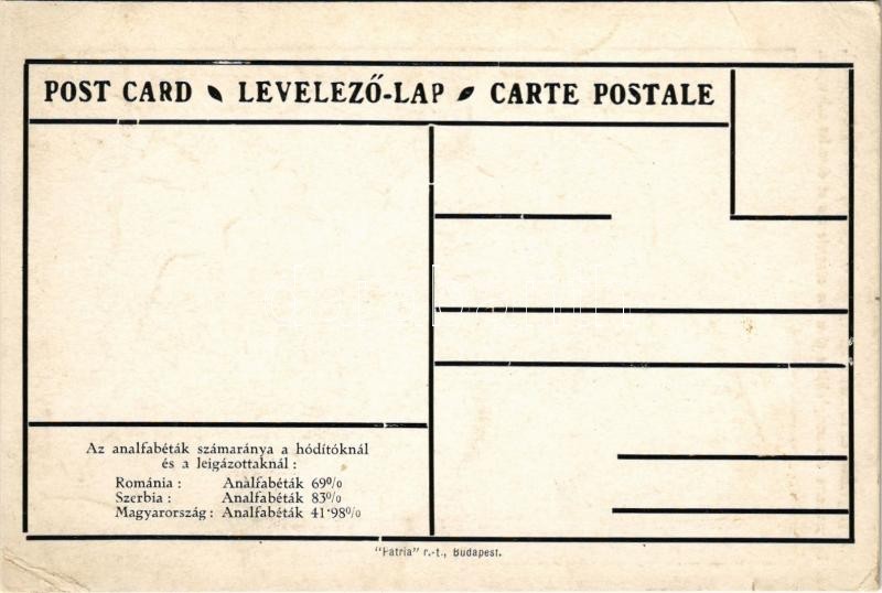 Az analfabéták számaránya a hódítóknál és a leigázottaknál: Románia, Szerbia, Magyarország. Kiadja a Pátria r.-t. / "The proportion of illiterates" Hungarian irredenta propaganda art postcard, Trianon s: Bér (EK)