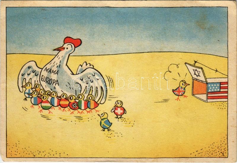 Mama Europa / Román kiadású antiszemita gúnylap, zsidó Amerika / WWII Romanian mocking propaganda card with chicken, swastika sign, Jewish America. Judaica art postcard (EB)