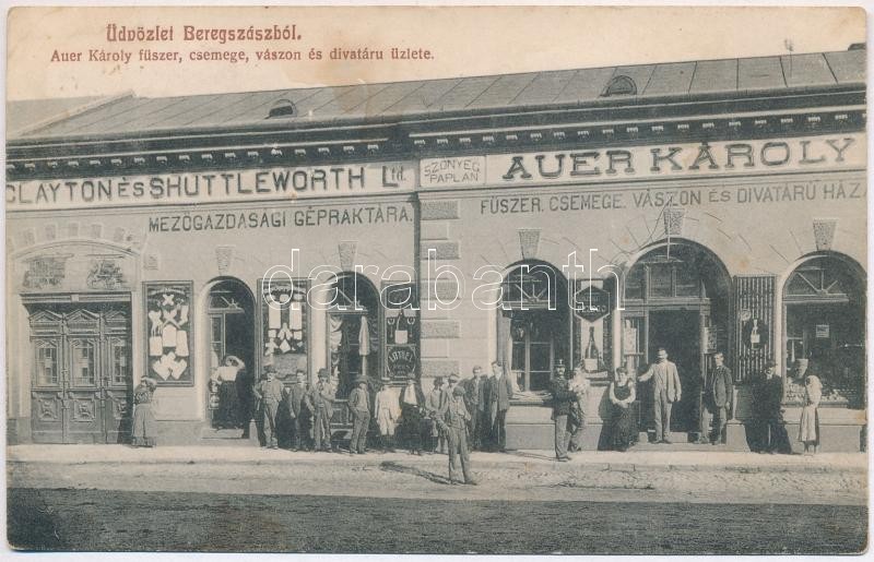 1910 Beregszász, Beregovo, Berehove; Auer Károly fűszer, csemege, vász... https://www.darabanth.com/de/36-Gross-Auktion/36.1/Ansichtskarten/Karpatenukraine~15428/1910-Beregszasz-Beregovo-Berehove-Auer-Karoly-fuszer-csemege-vaszon-es-divat-aruhaza-Cl~II2484983