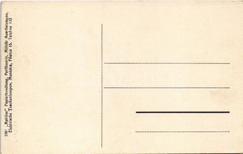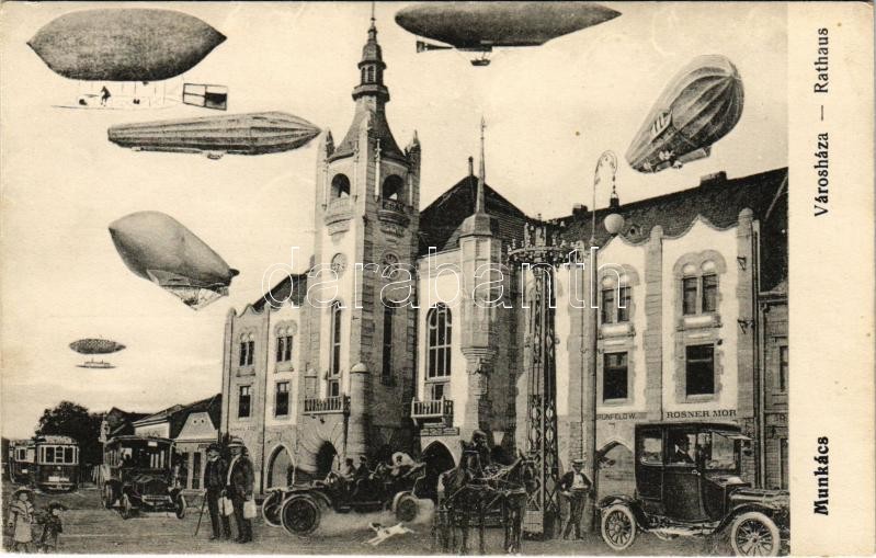 Munkács, Mukacheve, Mukacevo; Városháza, Rosner Mór, Grünfeld és Kahan Áron üzlete. A jövőben montázs, Reklám kiadása / town hall, shops. In the future montage