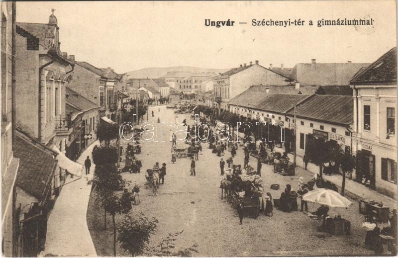 Ungvár, Uzshorod, Uzhhorod, Uzhorod; Széchenyi tér, gimnázium, piac, bor és sörcsarnok korcsma. Vasúti levelezőlapárusítás 9103. / square, school, market, wine and beer hall