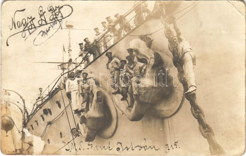 1915 SMS Szent István az Osztrák-Magyar Haditengerészet Tegetthoff-osztályú csatahajó matrózai a horgonyokon pózolnak / K.u.K. Kriegsmarine / WWI Austro-Hungarian Navy Tegetthoff-class dreadnought battleship, mariners posing on anchors. photo (EK)