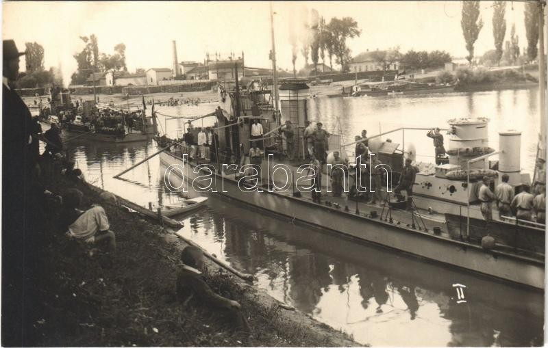 1925 Baja, Magyar Királyi Folyamőrség "KECSKEMÉT" és "SZEGED" WELS típusú őrnaszádok matrózokkal a fedélzeten / Hungarian Royal River Guard ship "KECSKEMÉT" and "SZEGED", mariners on deck. photo (ragasztónyom / gluemark)