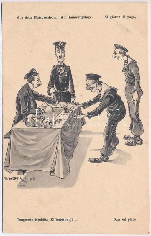 Aus dem Matrosenleben: Am Löhnungstage, K.u.K. Kriegsmarine Matrose / WWI Austro-Hungarian Navy mariner humour art postcard. C. Fano, Pola 1910-11. 2160. s: Ed. Dworak
