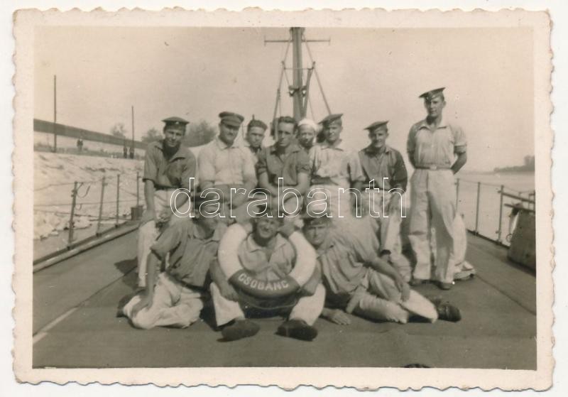 Magyar Királyi Folyamőrség "CSOBÁNC" anyaghajója, üzemanyagellátó és parancsnoki hajó, matrózok csoportképe / Hungarian Royal River Guard depot ship "CSOBÁNC", mariners. photo (fl) (8,2 x 5,8 cm)