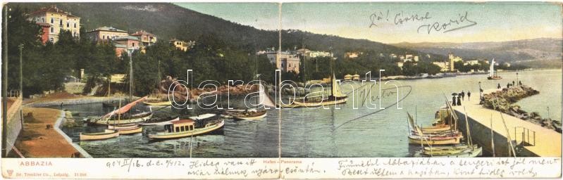 Beschreibung: 1904 Abbazia, Opatija; Kikötő. Két részes kihajtható panorámalap / port. 2-tiled folding panoramcard (Rb)