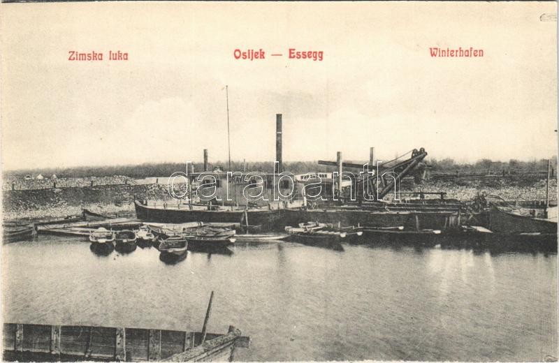 Eszék, Essegg, Osijek; Téli kikötő MKÁ Dráva kotró uszály, halászhajók... https://www.darabanth.com/de/36-Gross-Auktion/36.1/Ansichtskarten/Kroatien~15427/Eszek-Essegg-Osijek-Teli-kikoto-MKA-Drava-kotro-uszaly-halaszhajok-Zimska-Luka-Win~II2370622