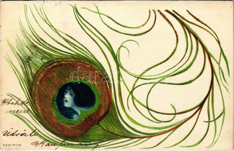 1901 Art Nouveau peacock feather lady. E.A.W. No. 1240. litho. Unsigne... https://www.darabanth.com/de/36-Gross-Auktion/36.1/Ansichtskarten/Kunstlerkarten~15499/1901-Art-Nouveau-peacock-feather-lady-EAW-No-1240-litho-Unsigned-Raphael-Kirchner~II2489305