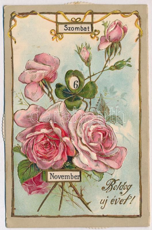 Beschreibung: Boldog Újévet! Dombornyomott litho mechanikus naptár képeslap rózsákkal / Embossed litho mechanical calendar postcard. Emb. litho