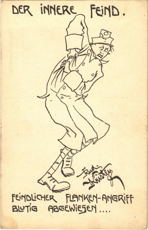 1917 Der Innere Feind. Feindlicher Flanken-Angriff blutig abgewiesen... / WWI Austro-Hungarian K.u.K. military art postcard, humour, support fund. Deutschmeister Witwen- und Waisen-Stiftung (Aktion im Felde) Nr. 40. s: Rud. Kristen