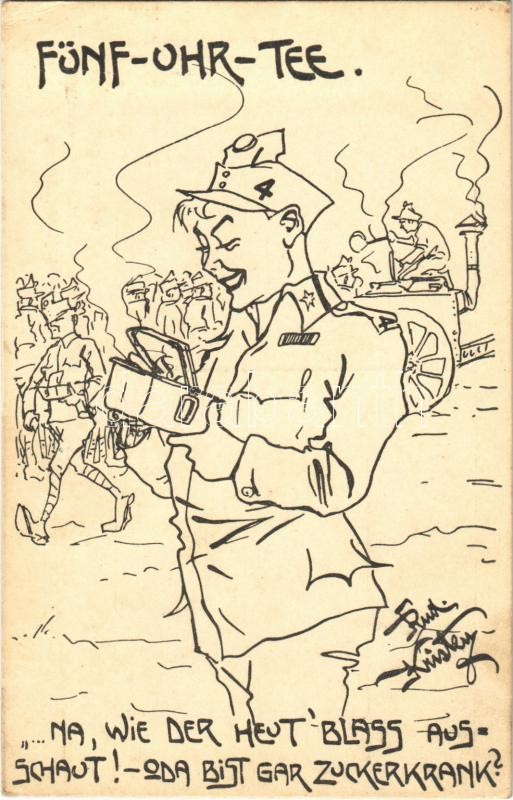1917 Fünf-Uhr-Tee. Na, Wie der Heut' Blass ausschaut! - Oda bist gar zuckerkrank? / WWI Austro-Hungarian K.u.K. military art postcard, humour, support fund. Deutschmeister Witwen- und Waisen-Stiftung (Aktion im Felde) Nr. 35. s: Rud. Kristen (EK)
