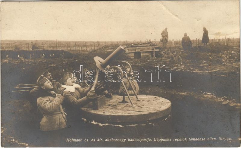 Géppuska repülők támadása ellen (légvédelmi géppuska) a Strypa mentén. Hofmann cs. és kir. altábornagy hadcsoportja felvétele. Hadifénykép Kiállítás, Hadsegélyező Hivatal kiadványa / WWI Austro-Hungarian K.u.K. military, soldiers with anti-aircraft gun along the Strypa river (Ukraine)