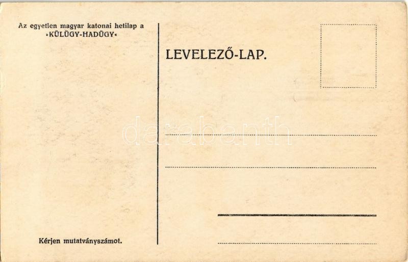Külügy-Hadügy egyetlen magyar katonai hetilap reklámlapja. Budapest Né... https://www.darabanth.com/de/36-Gross-Auktion/36.1/Ansichtskarten/Militaria~15493/Kulugy-Hadugy-egyetlen-magyar-katonai-hetilap-reklamlapja-Budapest-Nepszinhaz-utca-16-Hun~II2486604