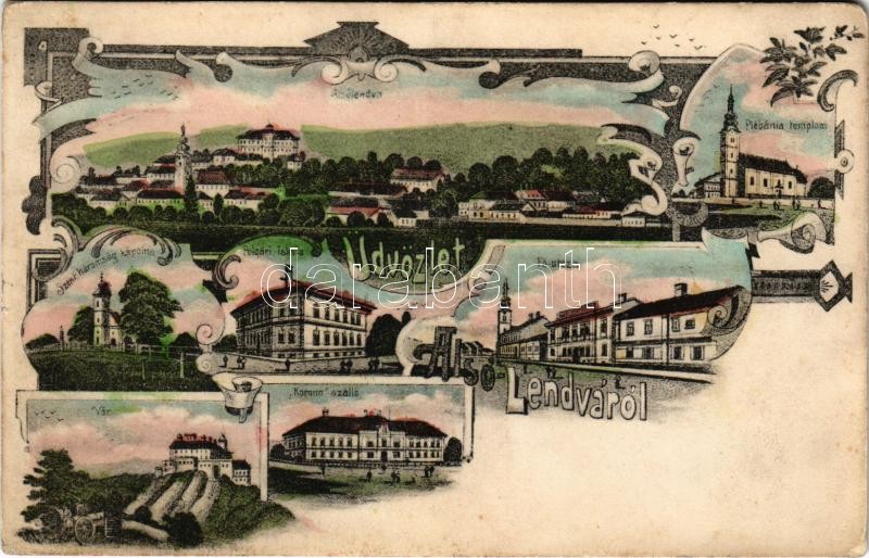 Alsólendva, Alsó-Lendva, Dolnja Lendava; plébánia templom, Fő utca, polgári iskola, Szentháromság kápolna, vár, Korona szálló. Balkányi Ernő kiadása / church, chapel, castle, main street, school, hotel. Art Nouveau, floral (EK)