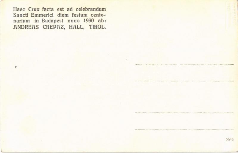 1930 Hall in Tirol, Haec Crux facta est ad celebrandum Sancti Emmerici diem festum centenarium in Budapest / A keresztet a budapesti Szent Imre év emlékére készítették / The cross was made for the 100th anniversary of the death of Saint Emeric of Hungary. Andreas Crepaz, Otto Schuricht photo