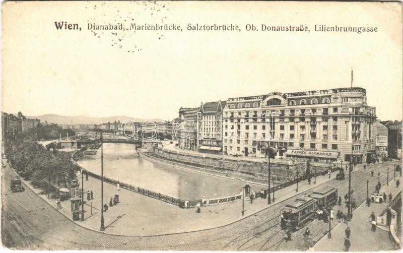 1936 Wien, Vienna, Bécs II. Dianabad, Marienbrücke, Salztorbrücke, Ob. Donaustrasse, Lilienbrunngasse, Hotel, Kaffee / street, hotel and cafe, tram (EK)