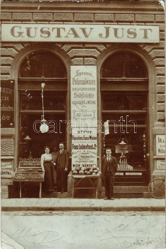 Wien, Vienna, Bécs IX. Gustav Just Specerei Colonialwaren, Delicatessen zum Bienenkorb, Depot Flaschen i. Fass-Weine Franz Leibenfrost & Co., Liechtensteinstrasse 1. / shop. photo (EK)