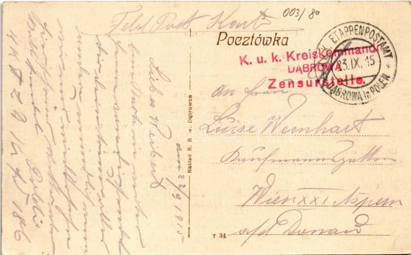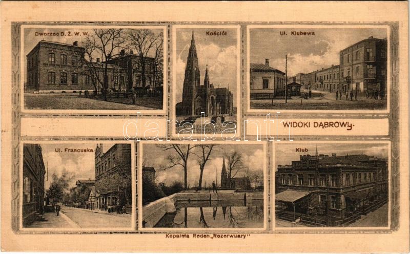 1915 Dabrowa Gornicza, Widoki Dabrowy; Dworzec DZWW, Kosciól, Ul. Klubewa, Klub, Ul. Francuska, Kopaima Reden "Rezerwuary" / railway station, street, church, club + "K.u.k. Kreiskommando Dabrowa Zensurstelle"